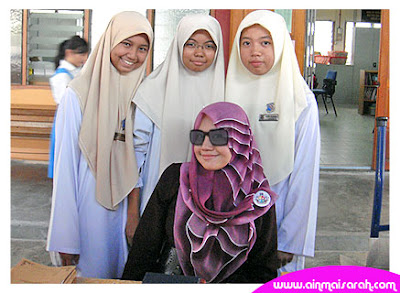 Okey.... kali ini Kak Ain mulakan sesi cuci-cuci mata melihat koleksi gambar pembaca AinMaisarah dengan gambar di bawah ini. Ianya gambar Kak Ain bersama Cik Adik Saadiah. Saadiah adalah pelajar tingkatan enam di sekolah bersebelahan. Mendapat tahu berita kedatangan Kak Ain ke SMK (P) Raja Zarina melalui adiknya. Habis waktu persekolahan, Saadiah terus ke SMK (P) Raja Zarina. Excited sangat kerana sudah membaca semua buku karya AinMaisarah! Kak Ain pun excited jumpa Saadiah yang peramah sekali =D